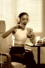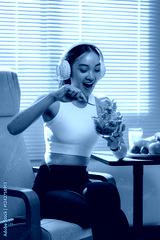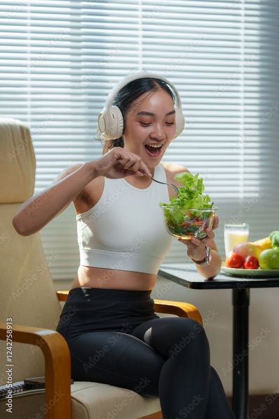 Young sportswoman sitting on a chair, enjoying a healthy salad while listening to music through headphones at home, embracing a moment of relaxation and nourishment