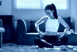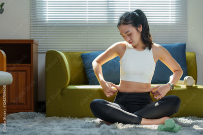 Asian woman in sportswear pinching her belly fat, expressing concerns about weight gain and considering a diet or workout routine for weight loss