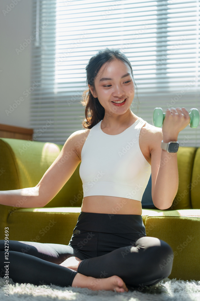 Smiling young asian woman is lifting a light green dumbbell while sitting in a yoga pose on a gray rug in her living room, promoting health, fitness, and wellness at home