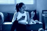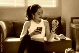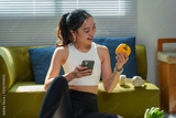 Smiling asian sportswoman wearing white top and black leggings sitting on floor at home checking nutritional information of yellow bell pepper using fitness app on smartphone