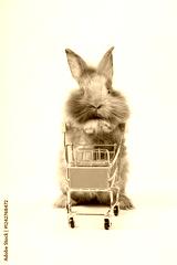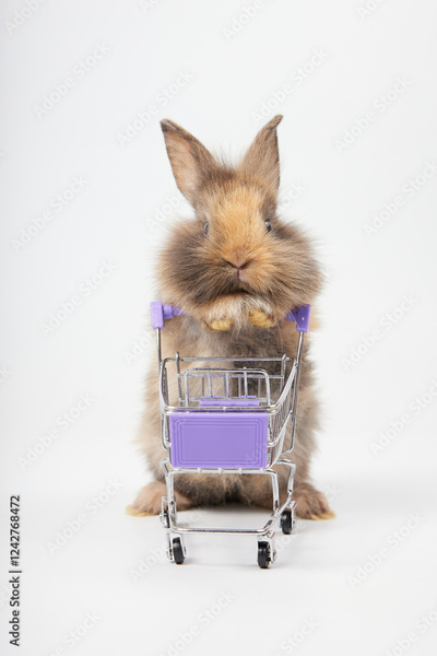 cute rabbit pushing empty shopping trolley cart and looking some food, isolated on white background