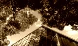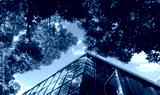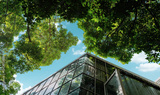 Modern glass office building with big trees around to reduce heat and carbon dioxide. Eco-friendly building. Sustainability concept