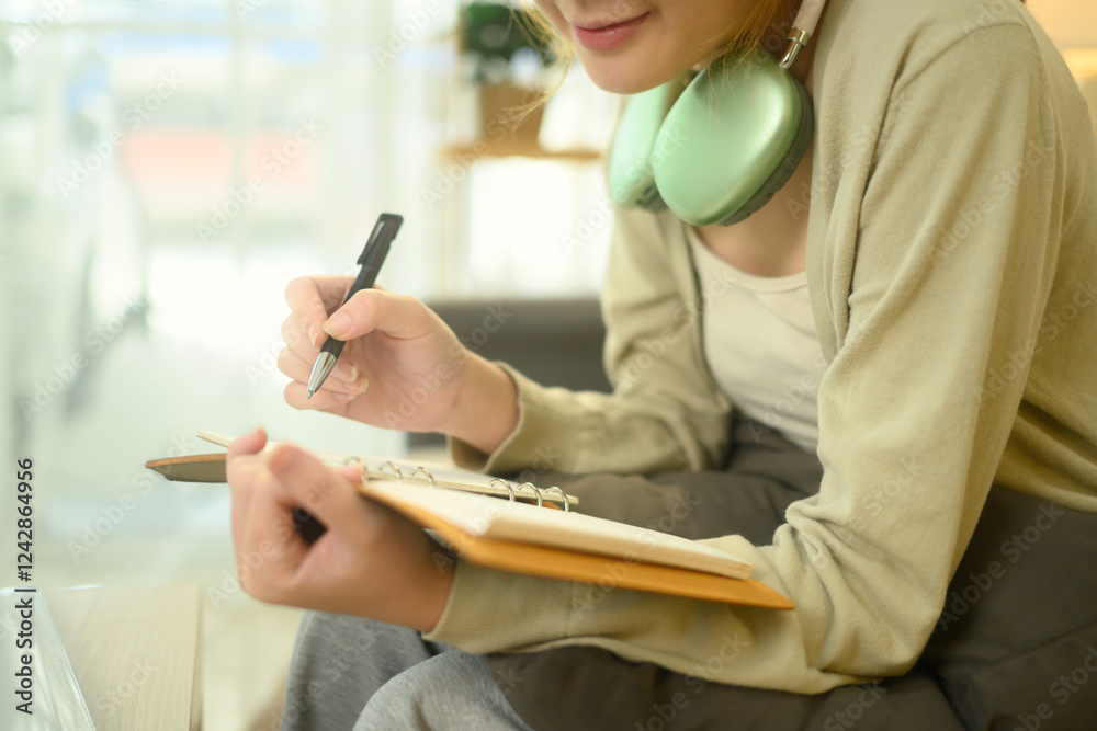 Smiling young woman sitting on a couch and writing in her notebook