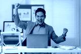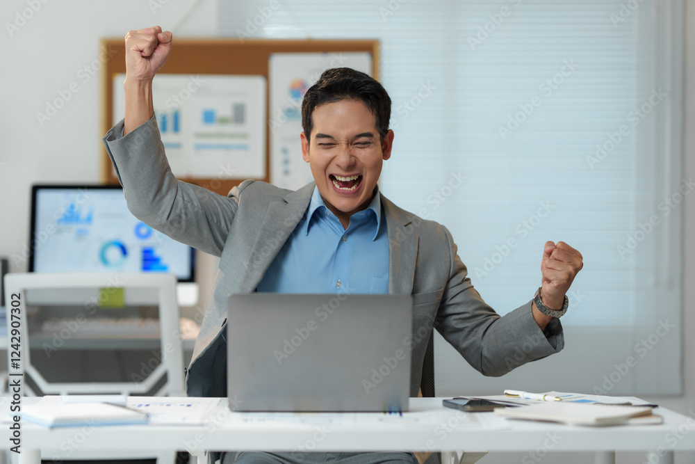 Young businessman sitting at his desk raising his fists in the air and shouting with excitement while looking at his laptop, celebrating a successful business deal or achievement