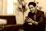 Young businessman sitting on a comfortable chair in an office lobby, smiling and using his smartphone, enjoying a moment of relaxation and connectivity