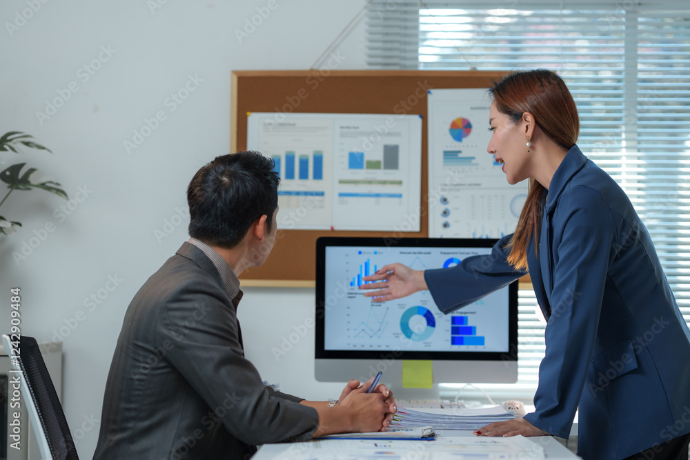 Businesswoman pointing at charts displayed on computer screen while explaining marketing strategy to businessman during a meeting in the office
