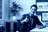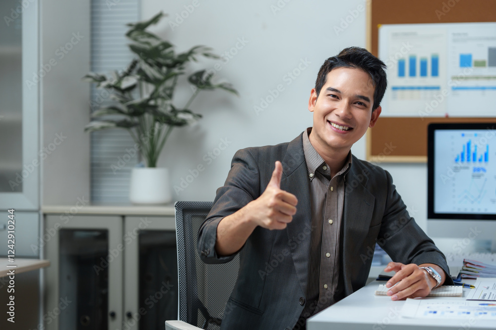 Young businessman showing thumbs up gesture while sitting at his desk in modern office, satisfied with successful business and good results analyzing financial data on computer