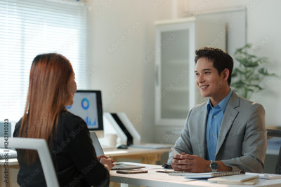 Happy businessman listening to his female colleague during a meeting in a modern office, they are discussing work and analyzing graphs on computer screen