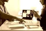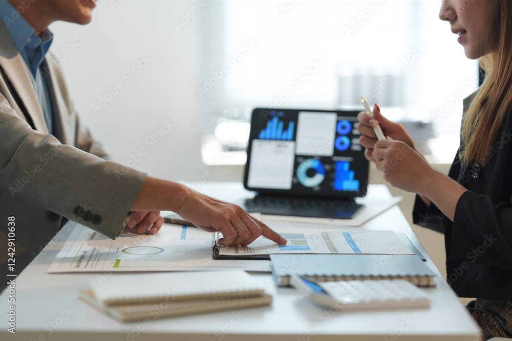 Two business professionals are analyzing financial charts and data on a tablet and paper documents, collaborating on market analysis, investment strategies, or business performance review
