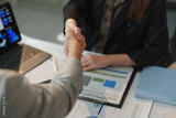 Two businesswomen shaking hands after reaching an agreement during a meeting in a modern office, celebrating their successful collaboration and partnership