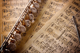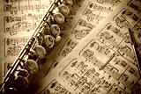 Flute with rod on old handwritten sheet music elevated view