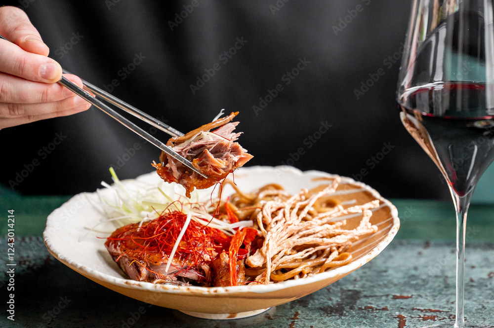 A hand holding chopsticks picks up savory meat from a dish filled with colorful ingredients. A glass of red wine is nearby, creating an inviting dining scene.