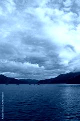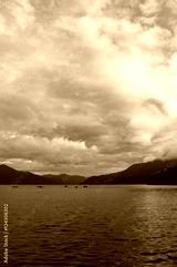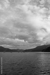Mountain lake on sunrise with fishing boats in the distance