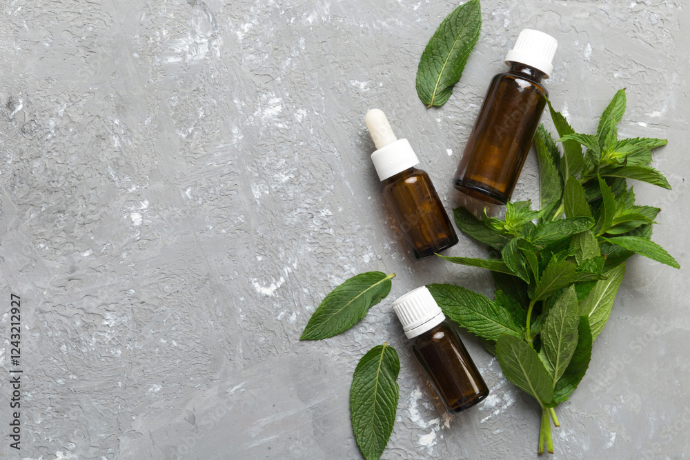 Natural Mint Essential Oil in a Glass Bottle. organic cosmetics with herbal extracts of mint on colored background