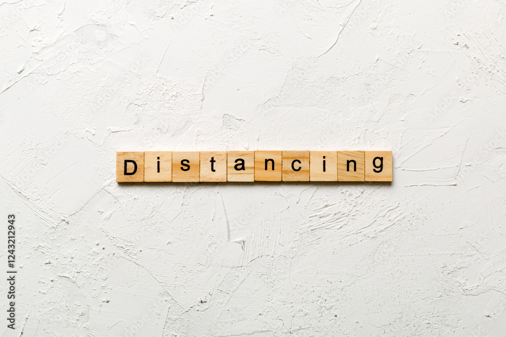 distancing word written on wood block. distancing text on cement table for your desing, concept