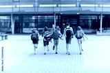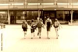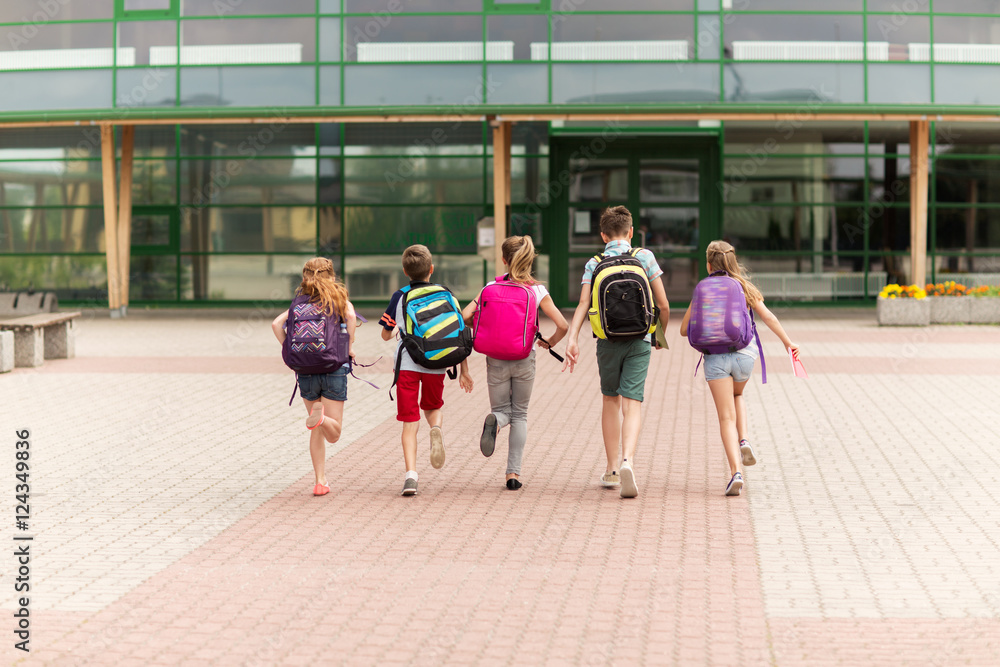 group of happy elementary school students running