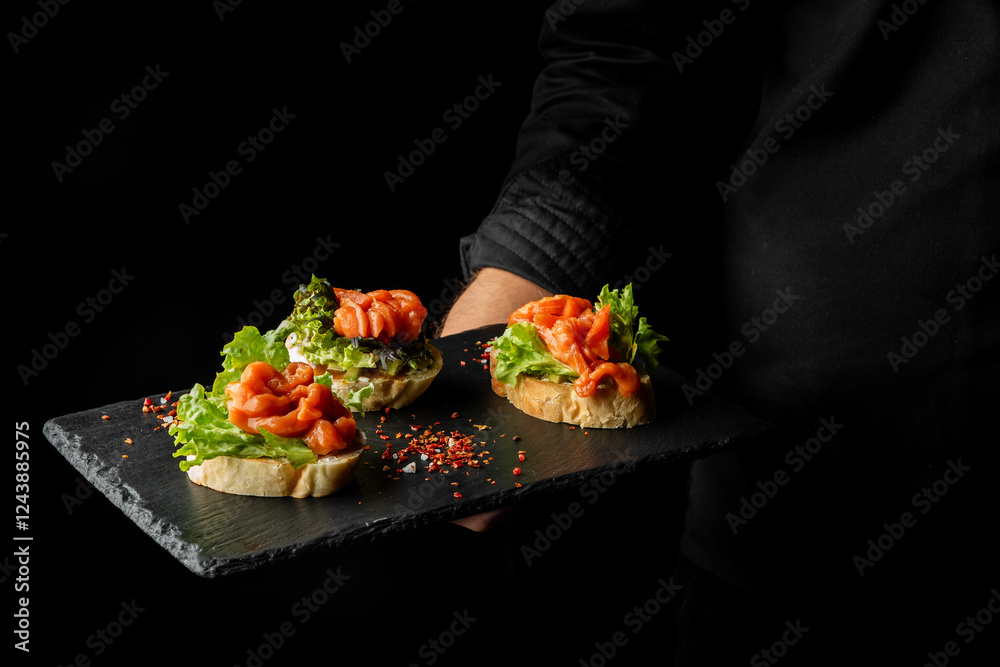 A chef presents gourmet open-faced sandwiches topped with fresh salmon and crisp lettuce on a black slate plate, showcasing an elegant and modern culinary dish.