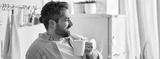 Charming man enjoying a cup of coffee in a stylish kitchen during a sunny morning