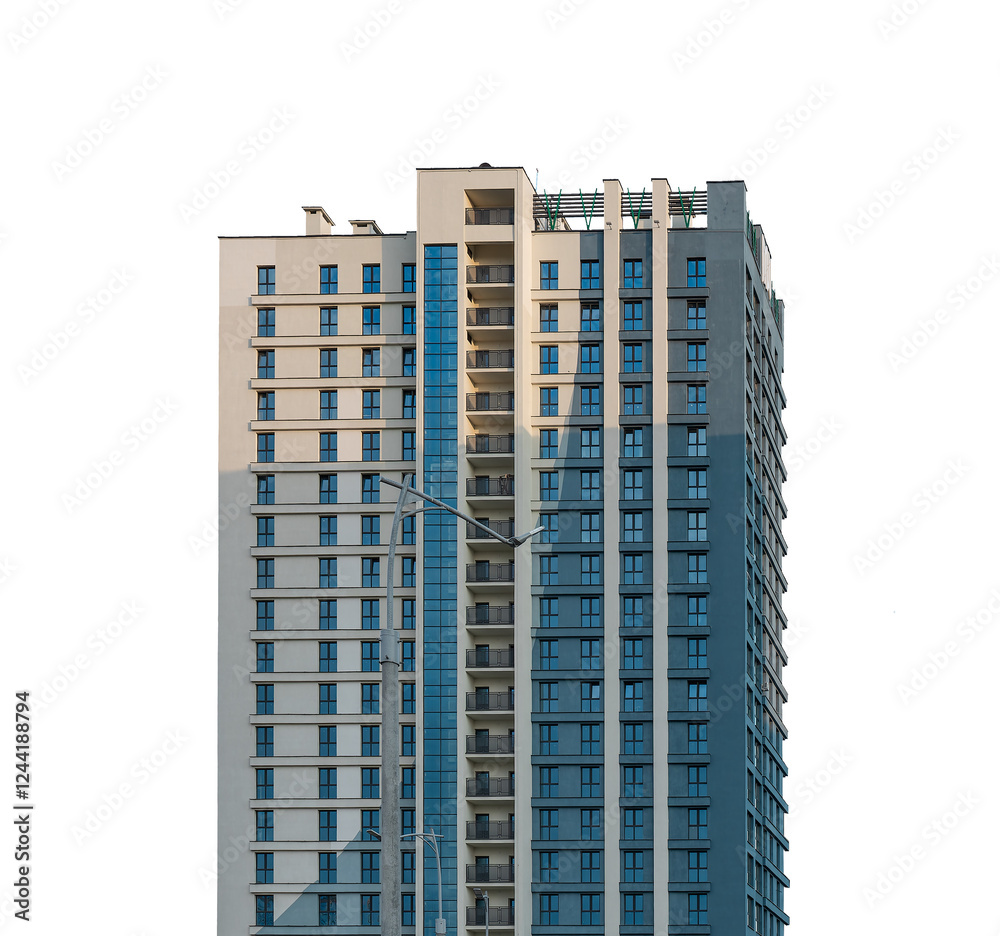 Modern high-rise residential building with sleek concrete facade, contemporary urban development in a metropolitan district. Isolated on white background.