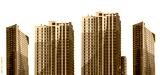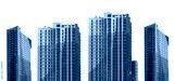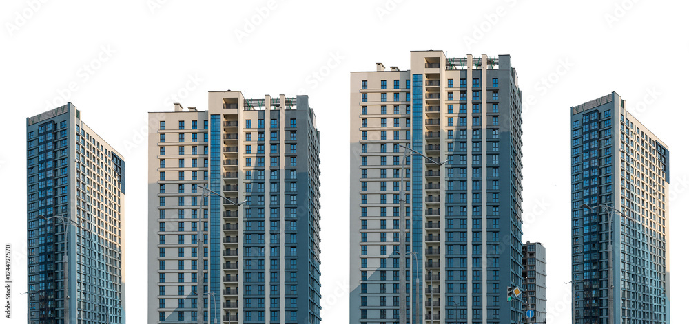 Modern residential apartment buildings set with sleek facades, tall high-rise structures in an urban district, contemporary real estate development. Isolated on white background.
