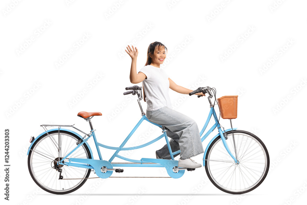 Young asian woman riding a tandem bicycle and waving