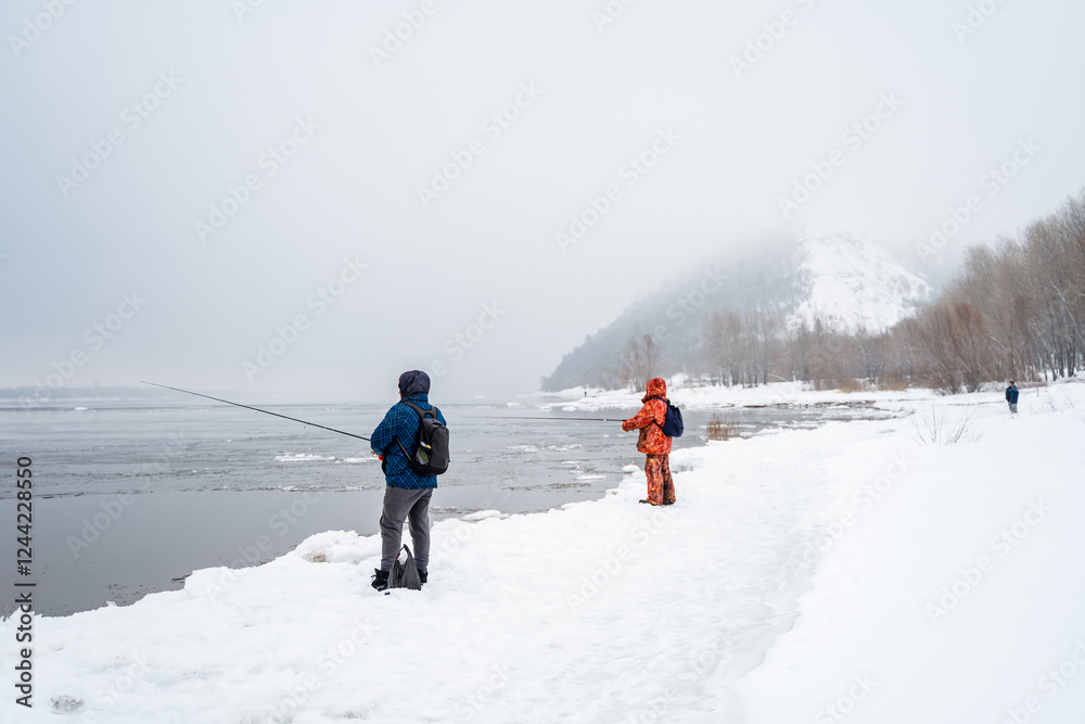 Fishermen with fishing rods stand on the banks of the Volga River and fish in winter. Winter fishing. Beautiful gloomy foggy landscape with mountains and ice on the river. Samara, Russia - 25 Dec 2024
