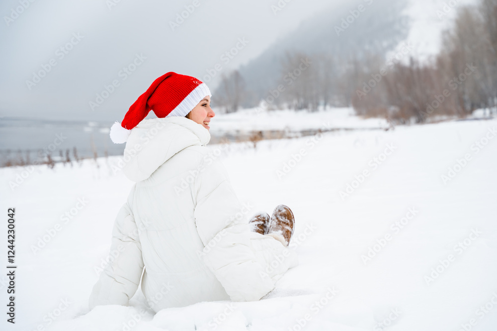 Portrait of a beautiful young woman in a winter red hat smiling and playing with snow, picturesque winter forest