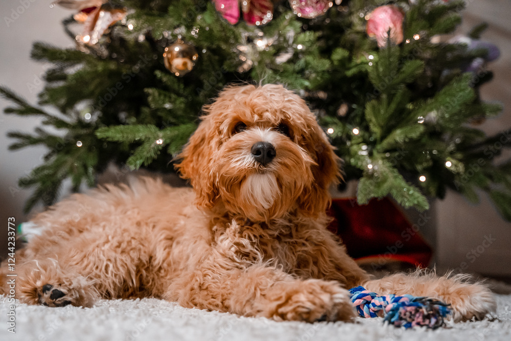 Dog of a Cavapoo or Cockapoo breed in home near Christmas tree and gifts. Close-up of curly brown Maltipoo.