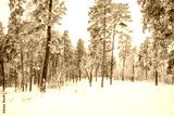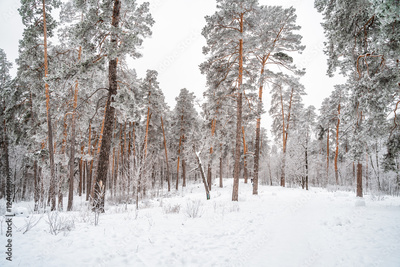 Scenic panorama of a beautiful snowy spruce and pine forest. Natural winter landscape.