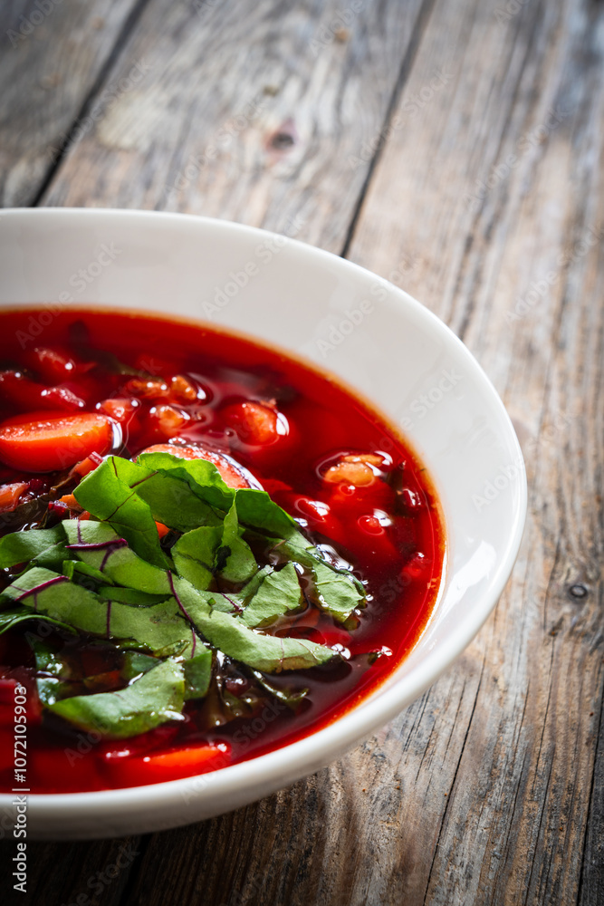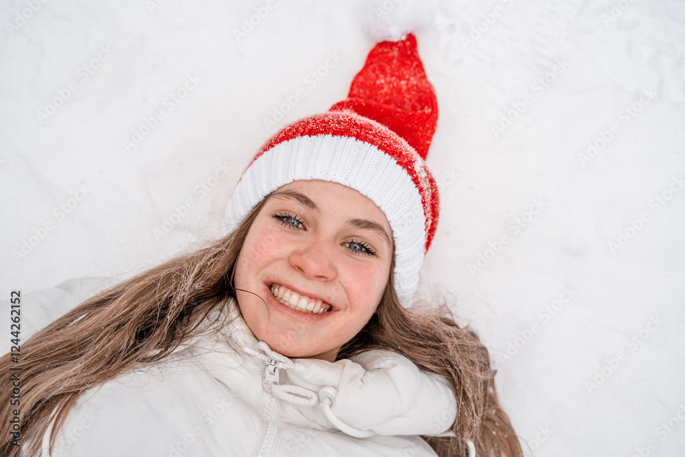 Portrait of a beautiful young woman in a winter red hat smiling and playing with snow, picturesque winter forest