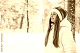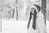 Portrait of a beautiful young woman in a winter red hat smiling and playing with snow, picturesque winter forest