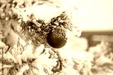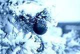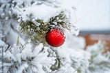 A red Christmas ball on a snow-covered branch of a fir tree swings in the wind outdoors