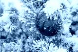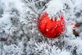 A red Christmas ball on a snow-covered branch of a fir tree swings in the wind outdoors