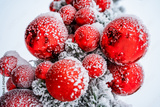 A red Christmas ball on a snow-covered branch of a fir tree swings in the wind outdoors