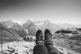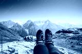 Feet trekking boots hiker selfie relaxing with mountains landscape view outdoor Travel Lifestyle concept active Summer vacations adventure