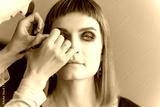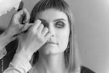 A skilled makeup artist meticulously adds finishing touches to a girl model's look