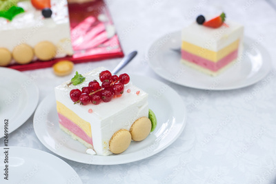 Strawberry Mousse Cake on the white Plate. Mousse dessert. Mouss