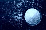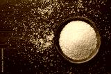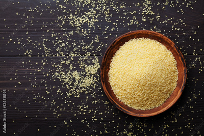 Raw couscous in bowl on dark wooden background from above