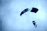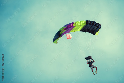Skydiver On Colorful Parachute In Sunny Clear Sky.