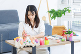 Asian beautiful attractive cheerful young cute lovely sweet woman wearing casual clothes, happy funny smile painting eggs sitting in the living room at home, prepare for Easter celebration concept.
