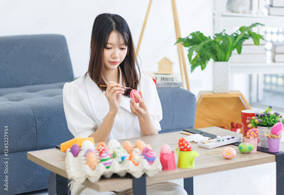 Asian beautiful attractive cheerful young cute lovely sweet woman wearing casual clothes, happy funny smile painting eggs sitting in the living room at home, prepare for Easter celebration concept.