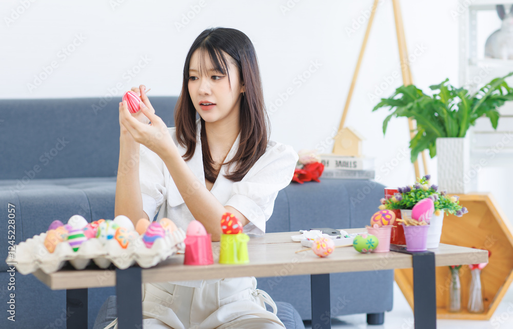 Asian beautiful attractive cheerful young cute lovely sweet woman wearing casual clothes, happy funny smile painting eggs sitting in the living room at home, prepare for Easter celebration concept.