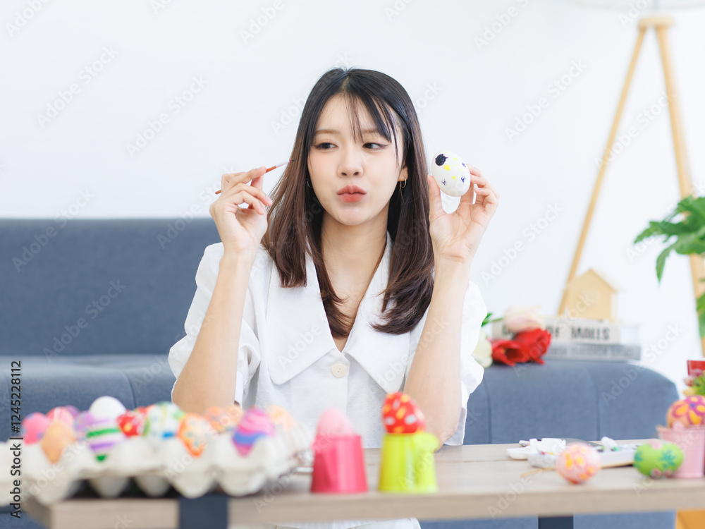 Asian beautiful attractive cheerful young cute lovely sweet woman wearing casual clothes, happy funny smile painting eggs sitting in the living room at home, prepare for Easter celebration concept.