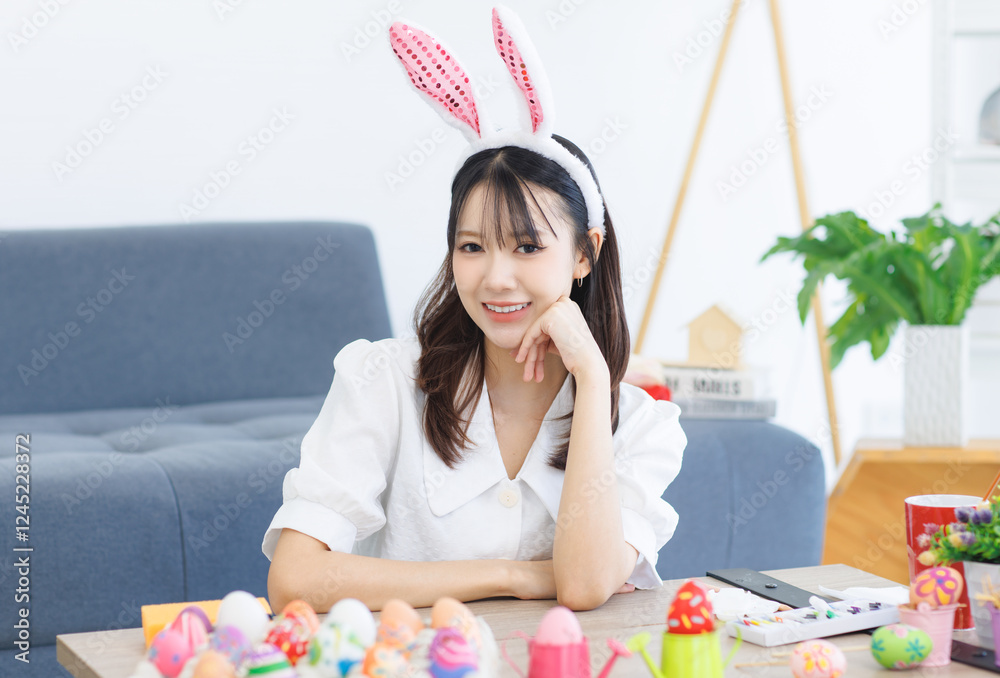 Asian beautiful attractive cheerful young cute lovely sweet woman wearing casual clothes bunny rabbit ears, happy smile look at camera at home with painted colorful eggs decorated for Easter celebrate