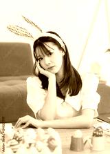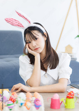 Asian beautiful attractive cheerful young cute lovely sweet woman wearing casual clothes bunny rabbit ears, happy smile look at camera at home with painted colorful eggs decorated for Easter celebrate