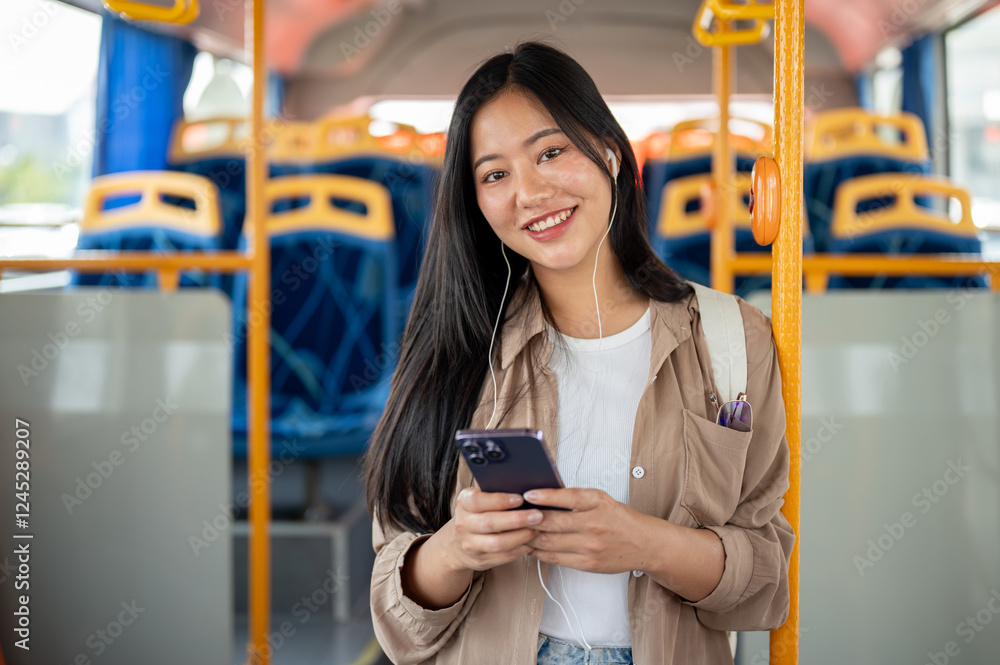 A beautiful Asian female college student rides a public bus to college in the morning.