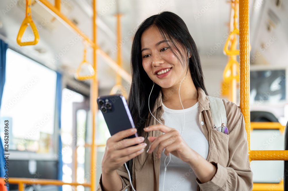 A smiling Asian woman listens to music and uses her smartphone on a public bus.