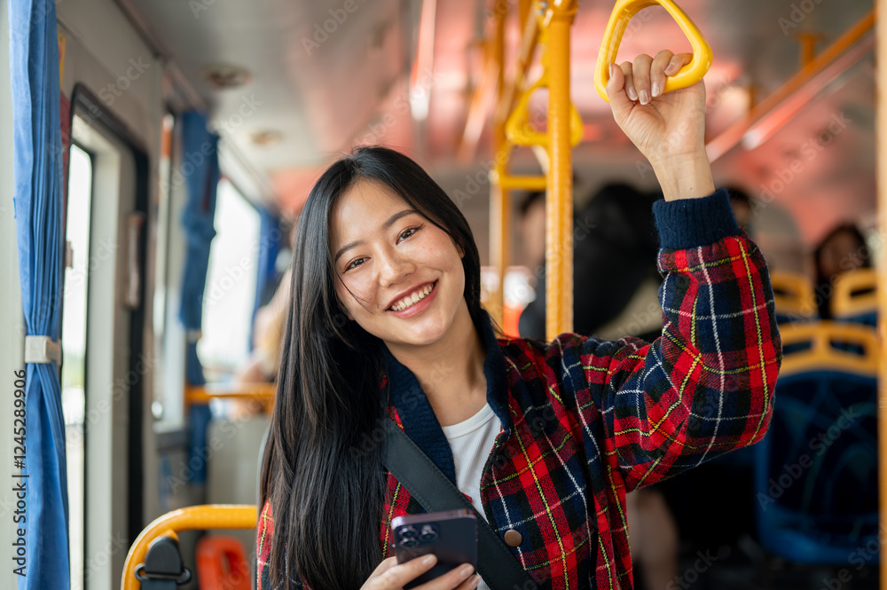A smiling Asian female college student holds a handrail while riding a bus to college in the morning