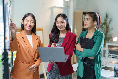 Asian businesswomen using laptop and discussing project strategy during meeting in modern office