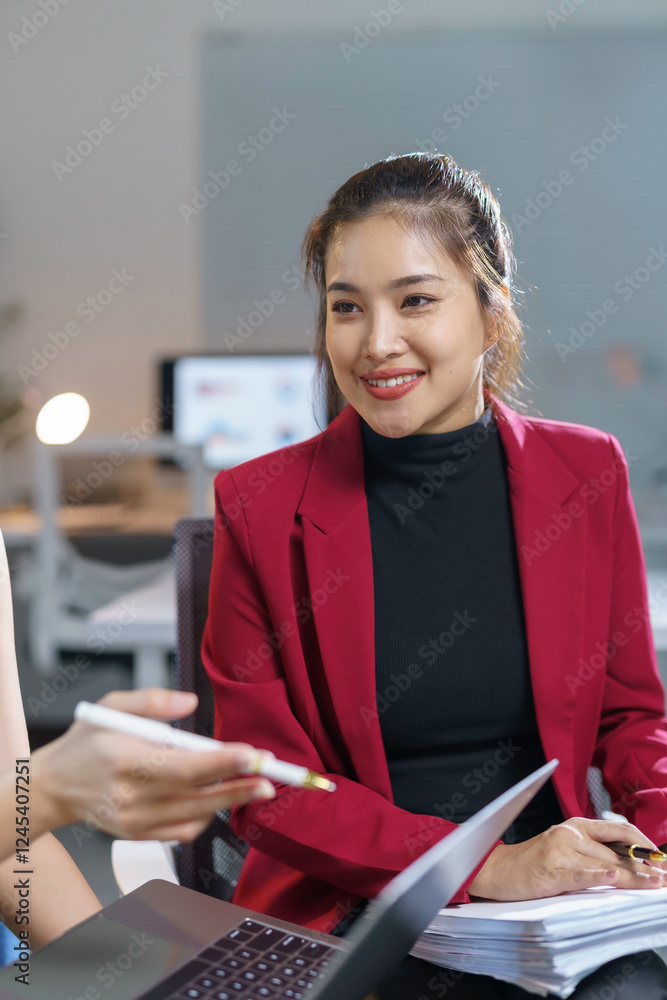 Businesswomen discussing and working together in modern office using laptop and documents